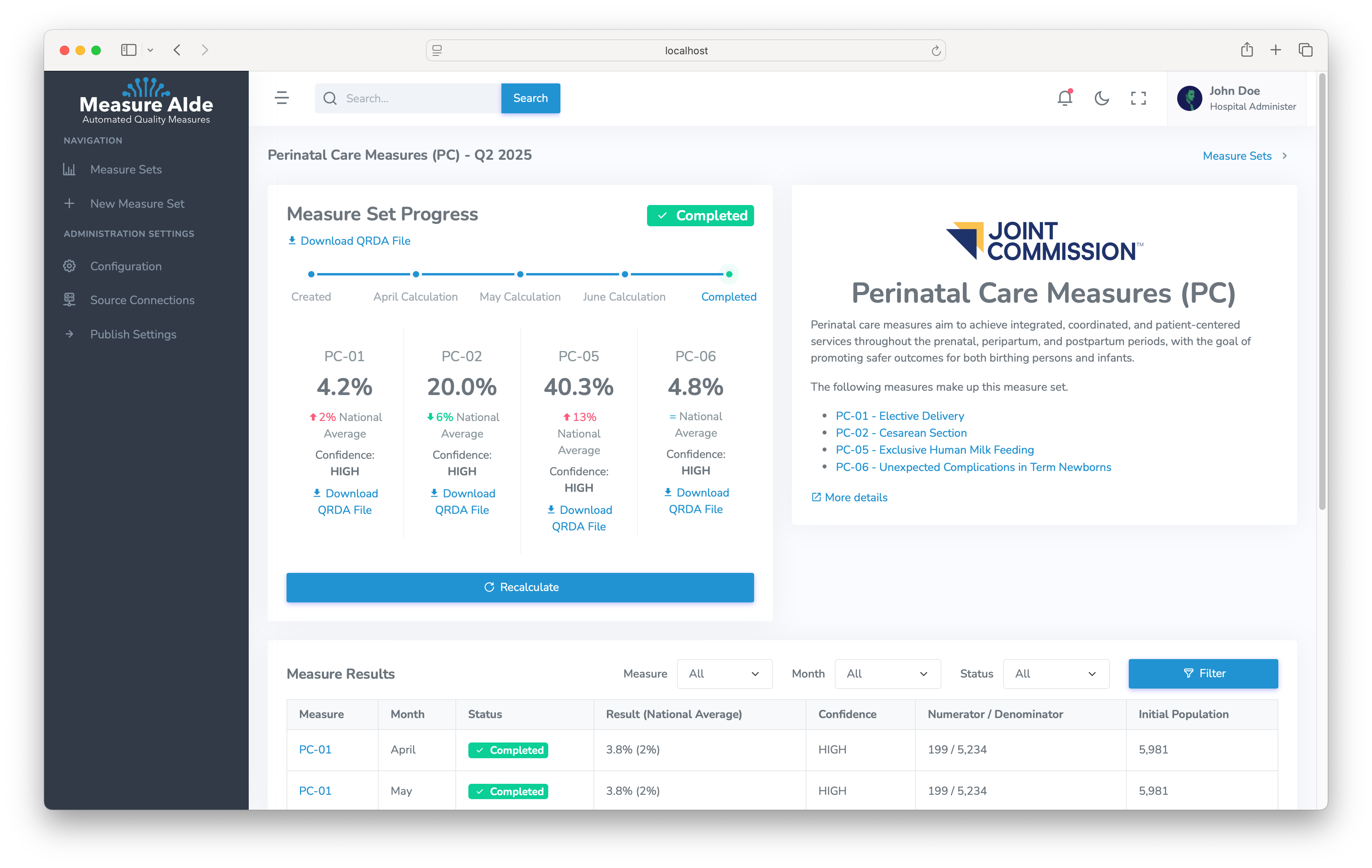 A completed measure set for PC that includes multiple PC measures (PC-1, PC-2, PC-5, PC-56) for a given quarter.
