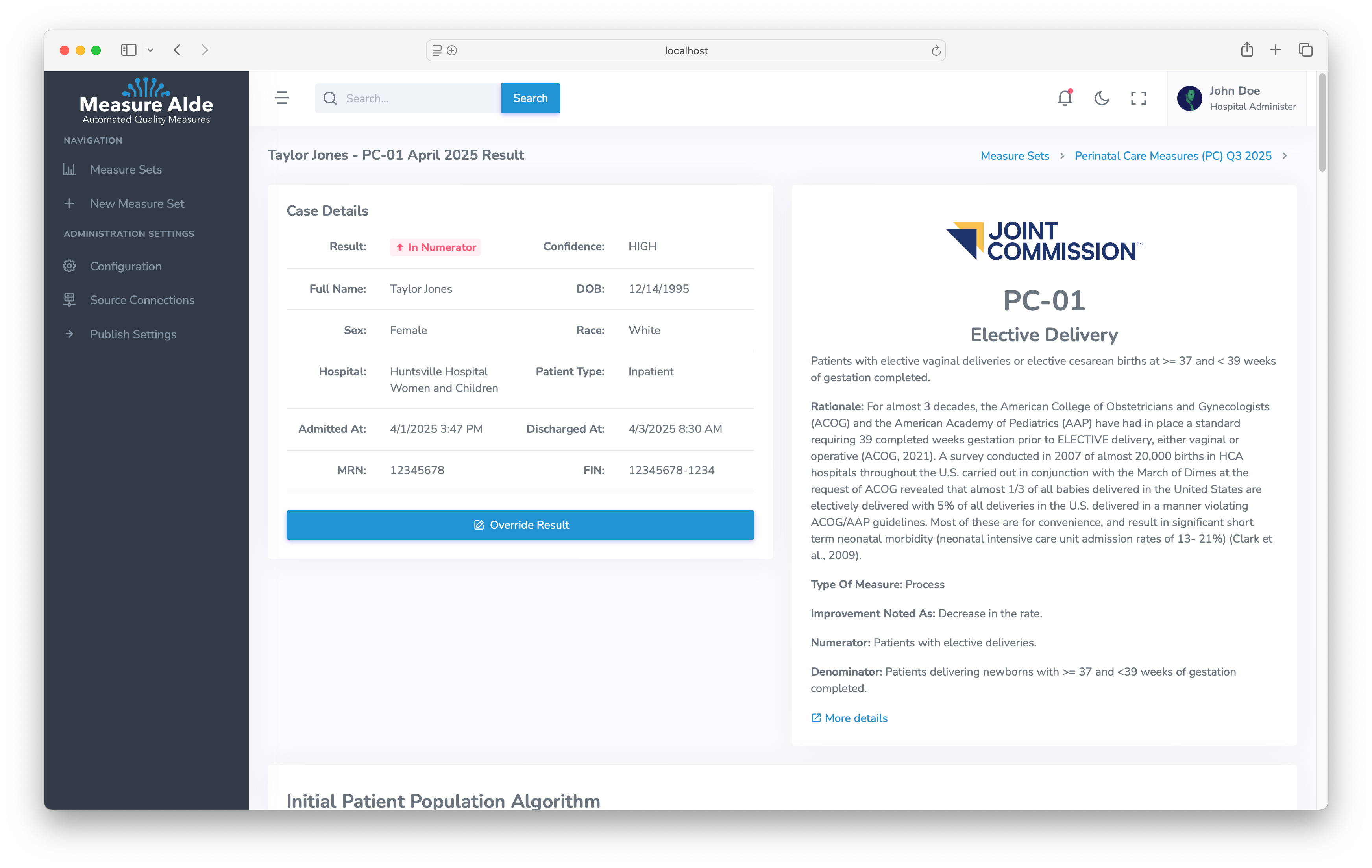 The following mockups illustrate several early design concepts for the Measure AIde user interface. These examples are intended to convey general ideas about layout, workflow, and interaction patterns within the system. They are preliminary, and we expect significant changes as the design is refined through usability testing, accessibility reviews, and integration with actual hospital data environments and workflows.